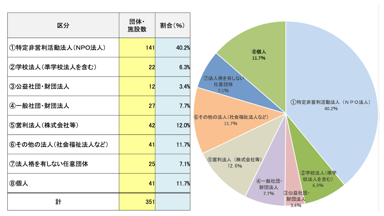 その規模や活動内容は多種多様であり、民間の自主性・主体性の下に設置・運営されています。平成27年度に文部科学省が実施した調査では、全国で474の団体・施設が確認されました。