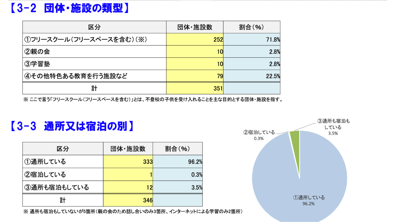 実際には通所型・オンライン型が大部分を占めており、文部科学省の調査でも「通所している」が96.2%という結果が出ています⬇︎