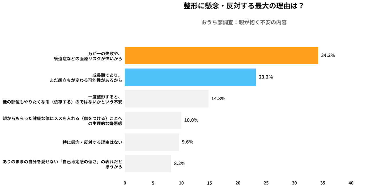 代わってデータから浮き彫りになったのは、保護者たちの極めて現実的な「リスク管理」の視点です。最多となったのは「万が一の失敗や後遺症などの医療リスク(34.2%)」で、これに「成長期による顔立ちの変化(23.2%)」を合わせると、全体の約6割(57.4%)が医学的・身体的な懸念を最優先していることがわかります。