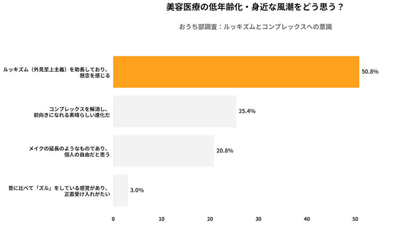 特筆すべきは、「整形はズルい」という価値観がわずか3.0%である点です。親世代は整形を道徳的な「ズル」とは捉えていません。しかし、半数以上がルッキズム社会そのものには強い懸念を抱いています。