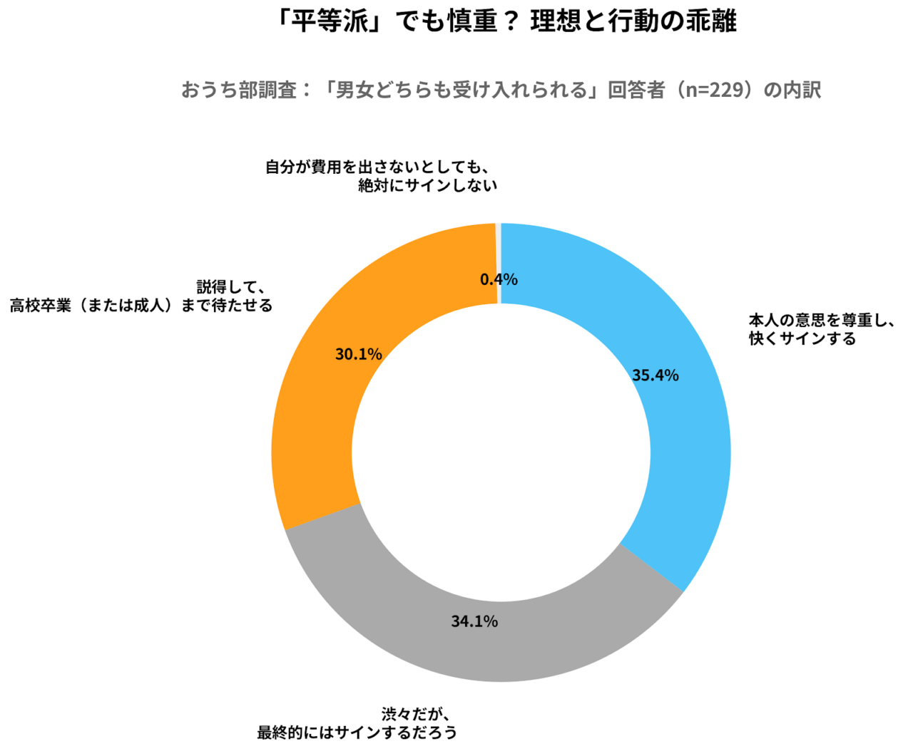 Q2で「どちらも同じように受け入れられる」と回答した229名(平等派)のうち、実際に「快くサインする」と答えたのは35.4%にすぎません。残りの約3割は「卒業まで待たせる」という慎重な姿勢を選択しています。