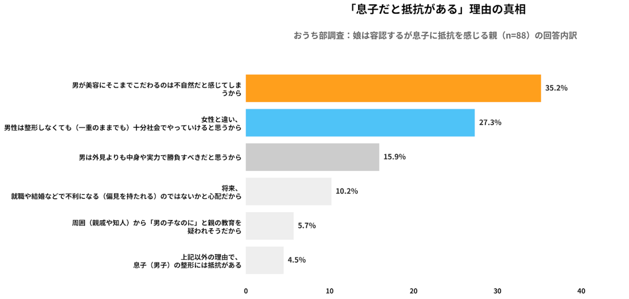 娘に対しては、失敗リスクや安全性を最大の懸念として挙げる一方で、息子に対しては「不自然」「(男性なら)外見に頼らなくても生きていける」といった、性別による役割期待や無意識のバイアスが、拒絶の強い要因となっている実態が伺えます。