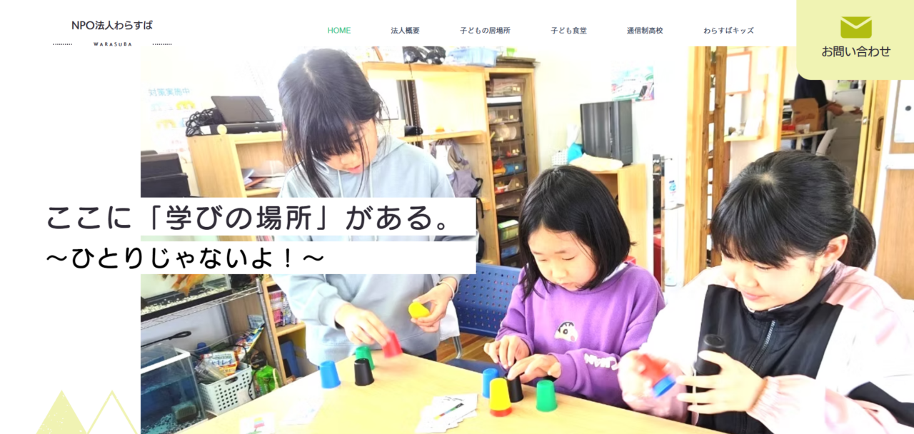NPO法人わらすばは、子ども達の育成・保健、医療または福祉の増進を図る活動を通して、市内近隣地域で子育てをしている両親・祖父母等、また子どもに接する全ての人々に対して、子どもの居場所作りと預かり業務・子どもの学習サポート・食(食材)の提供・子育て相談業務・不登校児のサポート・フリースクール開設・高校卒業までのサポート・ひきこもり対策・高齢者の居場所作り等に関する事業を行い、子どもの貧困を無くし、飢餓をゼロに、全ての人に健康と福祉を、質の高い教育をみんなに寄与することを目的としています。